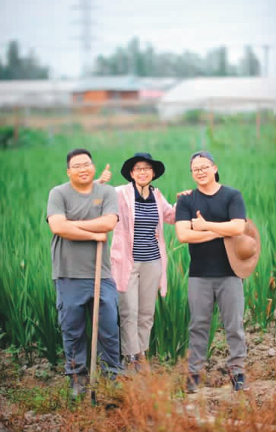 何耀顺(左)和团队成员在佛山贤鲁岛的台湾新农业示范基地耕作。 |