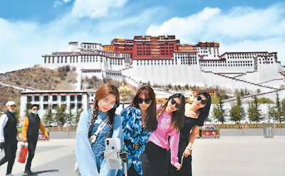 来自重庆的游客在西藏拉萨布达拉宫广场留影。 |