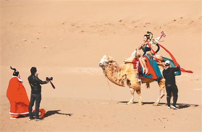 游客在甘肃敦煌鸣沙山月牙泉景区拍照。 |