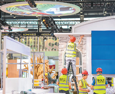 5月1日,在海南国际会展中心,参与首届中国国际消费品博览会的布展工作人员正在布置展台。 |