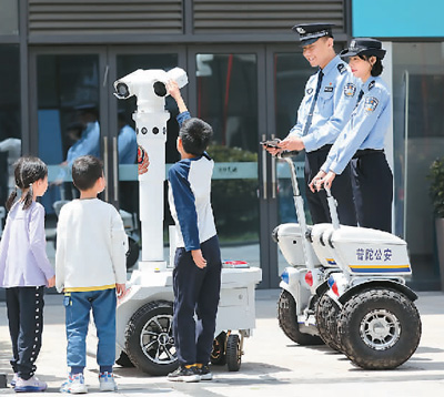 5月1日,浙江省舟山市公安局普陀区分局东港派出所民警带领5G警用机器人上岗,护航“五一”节日安保。 |