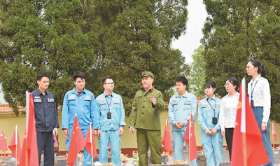 近日,南方电网广西崇左供电局利用本地红色资源,联合部队指战员、退役老兵、老党员组成宣讲团,讲述当地经济社会发展成就。图为老兵在凭祥市法卡山烈士陵园为青年讲述革命历史。