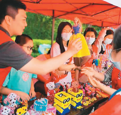“五一”期间,李京机没有出行计划,而是选择做义工参与义卖,为特殊群体贡献爱心。来自残障孩子的手编工艺品琳琅满目,李京机不时给游客们讲解工艺品背后的故事。