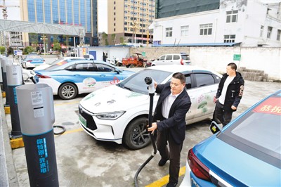 驾驶员在贵州省黔西南布依族苗族自治州安龙县电动汽车集中充电站给新能源纯电动出租汽车充电。 |