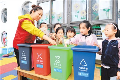 在安徽省合肥市瑶海区御景湾幼儿园,环保志愿者带领孩子们进行垃圾分类体验游戏。 熊 伟摄(人民图片)