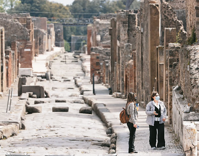 图为游客在意大利庞贝古城参观。