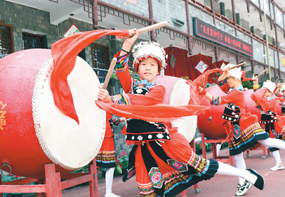 “五一”假期,湖南省湘西土家族苗族自治州吉首市寨阳小学为苗家留守儿童提供活动场所和义务辅导服务,让孩子们开展习苗鼓、吹唢呐及分享红色故事等有益活动,欢欢乐乐度假期。图为5月5日,苗家娃在打苗鼓。 |