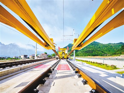 5月8日,在张(家界)吉(首)怀(化)铁路施工现场,由中铁四局主持研发的WPZ-500型无砟轨道智能铺轨机组顺利将一对500米长钢轨铺设到位,这标志着国内首套无砟轨道智能铺轨机组成功落地。图为施工现场。 史家民摄(人民视觉)