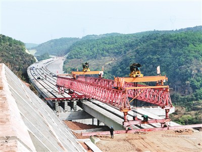 5月10日,在中铁二十二局集团技术人员指挥下,架桥机将最后一片混凝土预制T梁稳稳放入全线最高大桥横山2号桥的预定位置,“一带一路”通道重点工程昆明(岷山)至楚雄(广通)高速公路首段管段主体工程完工,为全线按期通车奠定坚实基础。图为架桥机进行架梁作业。 孔祥文 王智海摄(人民视觉)