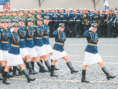 在俄罗斯莫斯科举行的胜利日阅兵式上,女兵列队走过红场。 叶甫盖尼·西尼岑摄(新华社发)