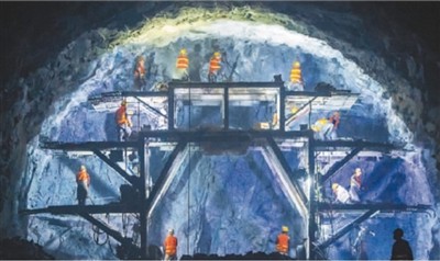 由中建路桥集团第四公司承建的河南新晋高速重点控制性工程韩口隧道近日顺利实现掘进1000米大关任务目标,该隧道是在建的世界第一长螺旋隧道。图为施工现场。