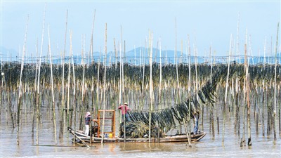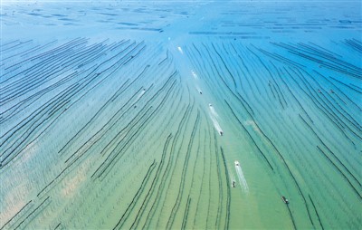 从空中俯瞰,海面上密密麻麻的竹竿与劳作的人们构成了一道亮丽的风景线。