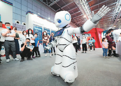 五月二十二日,北京科技周在中关村国家自主创新示范区展示中心开幕。图为现场机器人表演。