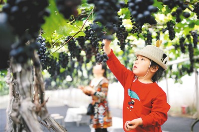 5月23日,游客在山东省青岛市即墨区移风店镇上泊村暖棚葡萄种植户的大棚里采摘葡萄。 梁孝鹏摄(新华社发)