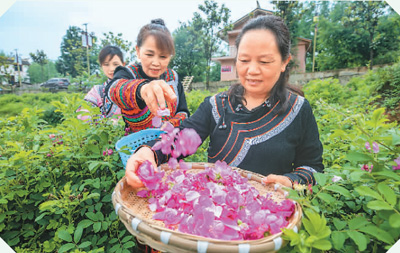 5月21日,贵州省毕节市金海湖新区响水乡青山村村民正在采收食用玫瑰花。 |
