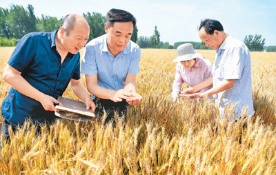 时下,安徽省亳州市686万亩小麦即将进入收获季节。经测产,小麦亩产量将超过650公斤。图为5月31日,在亳州市谯城区十河镇西关村,农业技术人员在麦田内进行小麦测产作业,为小麦大规模收获做准备。