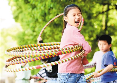 5月7日,湖南省郴州市嘉禾县塘村中心学校,学生在课间练习呼啦圈。 |