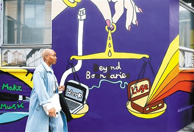 近日,英国伦敦,泰特现代美术馆附近的泰晤士河南岸街头,一系列以“超越界限”为主旨的艺术作品亮相。这些作品旨在给新冠肺炎疫情下的城市注入积极乐观的精神,为街头带来一抹靓色。图为一名行人从绘有艺术作品的墙前经过。