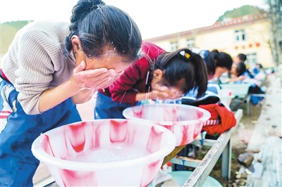 在西藏昌都市类乌齐县桑多镇第二小学,学生们用热水洗漱。这套热水设施由李纯民发起的“齐兴”助学奖励基金捐助。 |