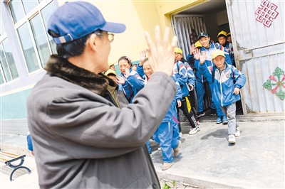 2021年5月4日,在西藏昌都市类乌齐县长毛岭乡第一小学,学生们跟李纯民道别。 |