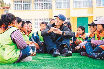 在西藏昌都市类乌齐县伊日乡小学,李纯民(中)和学生们交流。 |