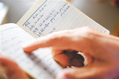 李纯民在天津家中翻阅当年的藏语学习笔记。初到西藏时,李纯民利用业余时间自学藏语,为了方便记忆,他用汉语拼音标注藏语发音。 |