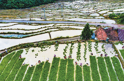 6月4日,在湖南省芷江侗族自治县牛牯坪乡千丘田村,300多亩梯田层层叠叠、高低错落,当地村民正忙碌耕田插秧。图为千丘田村的村民在田里劳作。 |