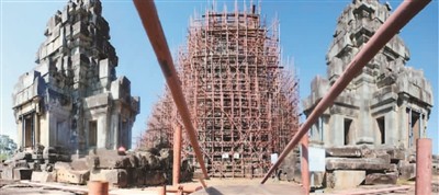 茶胶寺位于柬埔寨吴哥城胜利门外,是阇耶跋摩五世国王为自己建筑的国寺。现存遗址占地面积约4.6万平方米,主体建筑占地面积超1.3万平方米。茶胶寺建于10世纪末11世纪初,可能坐落于一组规模庞大建筑组群的中心位置。茶胶寺保护修复项目包括建筑本体保护修复、石刻保护、展示中心建设和环境整治。其中建筑本体修复涵盖26个修复点。图为中国援外考古队正在修复其中的庙山五塔。 |