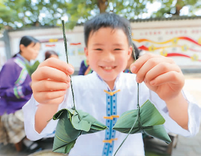 6月13日,江西省吉安市峡江县金坪民族乡新民村的小朋友展示包好的粽子。 周 欢 陈福平摄影报道