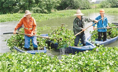 近年来,浙江省湖州市德清县新安镇严格落实河长制,定期对河道进行全方位清理,不断修复河湖生态,保护河湖综合功能,实现河畅、水清、岸绿、生态美。图为6月21日,在新安镇荷叶蒲漾河道上,保洁员在清除水葫芦。