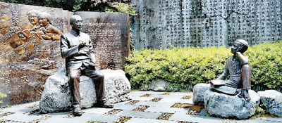 图为双龙洞景区叶圣陶与小学生的铜像。 |
