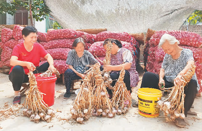 目前,山东省冠县斜店乡紫皮大蒜种植面积超过2万亩,亩收入达5000余元。近年来,该乡立足优势产业,积极发展大蒜种植,并探索多种线上线下销售渠道,让田间的小蒜头变成大产业,增加农民收入,促进乡村振兴。图为工作人员正在对大蒜进行分拣加工。