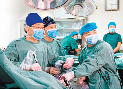 图为王学栋医师(左一)实施西藏首例4k腹腔镜胆总管结石手术。 |