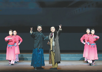 京剧《李大钊》中,由张建峰饰演的李大钊(左三)、张凯饰演的陈独秀(左四)演出剧照。 |