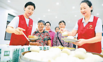 图一:7月26日上午,浙江省杭州市桐庐县富春江镇龙湾宾馆汛期安置点,党员志愿者为转移人员分发包子、牛奶、鸡蛋、油条等早餐。 |