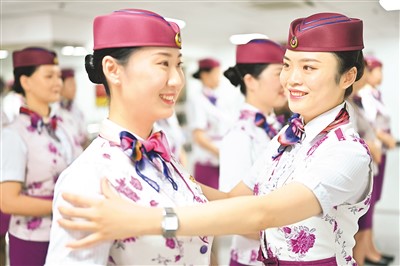 铁路暑运期间,某“复兴号”班组组织乘务人员进行集中培训,为暑运旅客提供更加优质的服务。 |