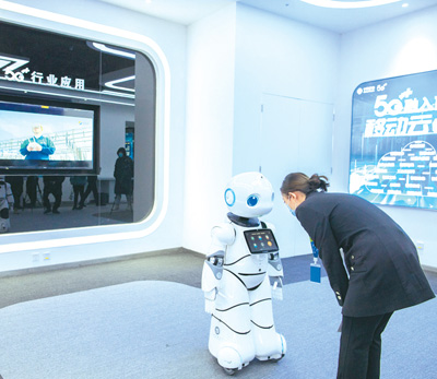 日前,内蒙古5G产业创新基地在和林格尔新区正式揭牌,该基地由和林格尔新区携手电信、移动、联通、铁塔、华为共同打造,是发挥多方资源优势开展5G产业创新、展示、应用的平台。图为工作人员在该基地展示区与机器人互动。 |