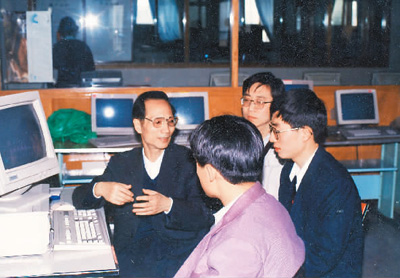 张钹(左一)在实验室与博士生讨论。(1995年) |