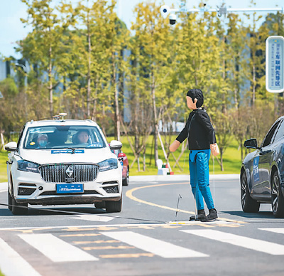 8月20日,在重庆举行的自动驾驶最强车脑挑战赛赛场,参赛的自动驾驶汽车在真实道路上挑战“行人横穿马路”交通场景。 |
