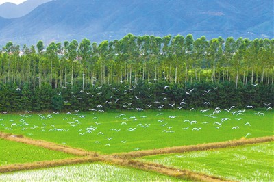 8月27日,江西省赣州市大余县黄龙镇大合村,一群白鹭正怡然自乐地嬉戏、觅食,灵动的身影与周围青山绿水融为一体,构成了一幅美丽的生态画卷。