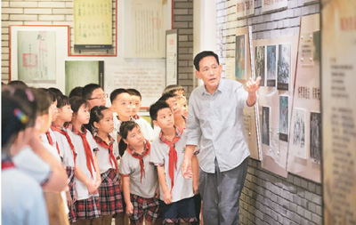 9月2日,在浙江省湖州市德清县洛舍镇砂村新四军纪念馆,退休教师俞守明正在为该镇中心学校的学生讲述先烈当年抗战的故事。