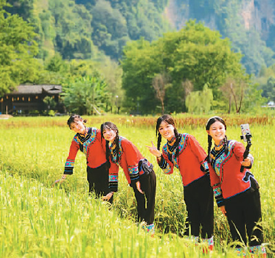 近日,世界自然遗产地湖南张家界武陵源核心景区恢复开放。图为黄龙洞景点导游员在稻田里通过网络直播家乡的美景。