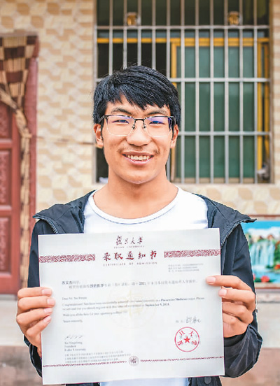 宁海民族中学第三届“海安班”学生苏文杰展示不久前收到的复旦大学录取通知书。 |