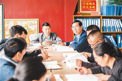 在宁海民族中学,海安老师王拥军(右四)作为化学备课组组长和同事一起备课。 |