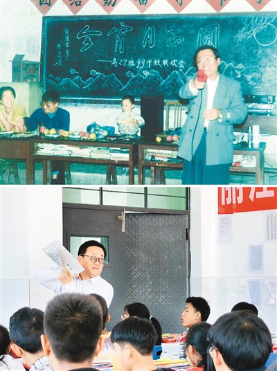 上半图为1999年9月,海安老师王霖伯在宁蒗宁海民族中学高27班教室过中秋节;下半图为2021年4月23日,王霖伯在宁蒗二中高103教室上课。 |