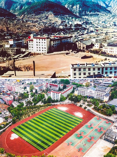 过去,宁海县办学条件艰苦,海安支教老师和当地教师一样住着用木板隔开的简易宿舍、喝着浑浊的水,常常因变压器跳闸而用不上电,但他们仍坚持不懈,辛勤耕耘。如今,当地办学条件早已大大改善。上半图为20世纪90年代的宁海民族中学;下半图为宁海民族中学新貌。 |