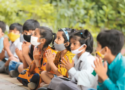9月1日,佩戴口罩的学生在印度普拉亚格拉杰一所学校里集合。