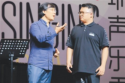 上海音乐学院院长廖昌永(左)在第三届“深圳声乐季”上给学员上大师课。 |