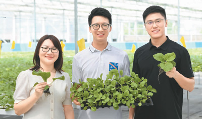 图为罗伟特、梁立锋、谭慧敏(从右至左)近日在鱼菜共生生产基地拿着“水口白菜”合影。