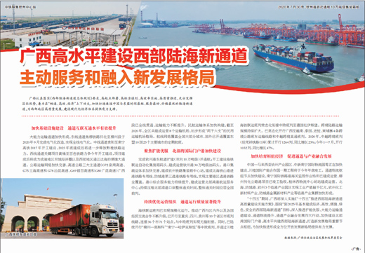 广西认真落实《西部陆海新通道总体规划》要求,高起点部署、高标准谋划、高效率实施、高质量推进,充分发挥区位优势,着力在“畅通、高效、经济”上下功夫,加快打造连接中国与东盟时间最短、服务最好、价格最优的陆海新通道,为西部地区高质量发展、建设现代化经济体系提供有力支撑。